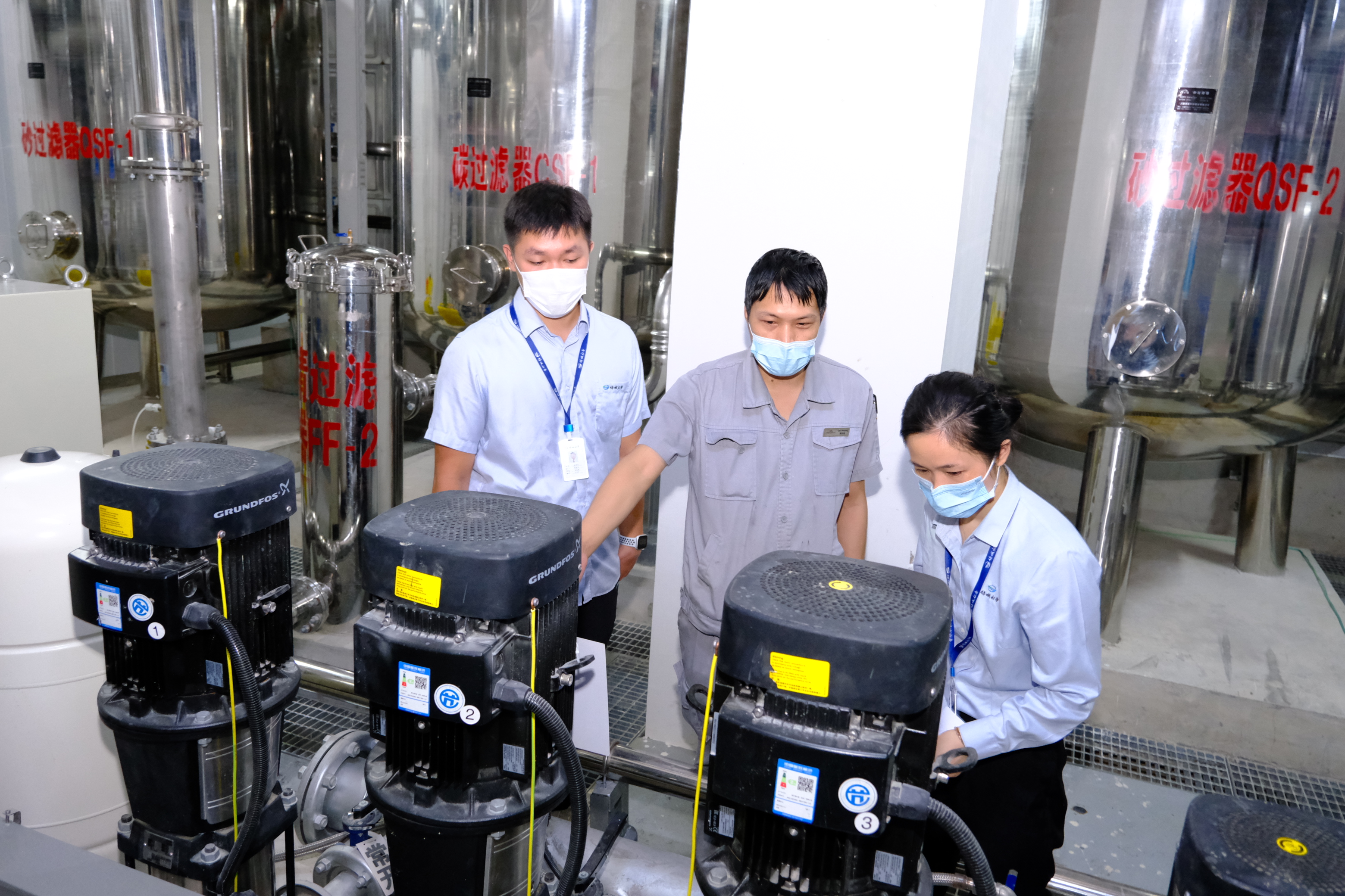 圖為營業(yè)處二供技術(shù)管理班正在會展豪生酒店巡檢二次供水設(shè)備運(yùn)行情況。