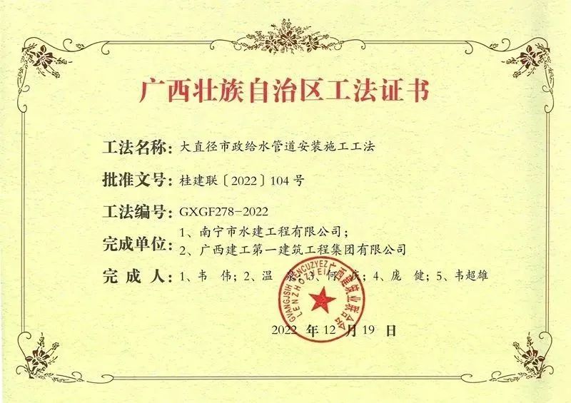 在2022年度廣西壯族自治區(qū)級(jí)工程建設(shè)工法評(píng)審活動(dòng)中,由廣西綠城水務(wù)股份有限公司下屬南寧市水建工程有限公司(下簡(jiǎn)稱“水建公司”)組織申報(bào)的《大直徑市政給水管道安裝施工工法》,經(jīng)自治區(qū)級(jí)工程建設(shè)工法評(píng)審委員會(huì)評(píng)審,成功獲評(píng)為2022年廣西壯族自治區(qū)級(jí)工程建設(shè)工法。