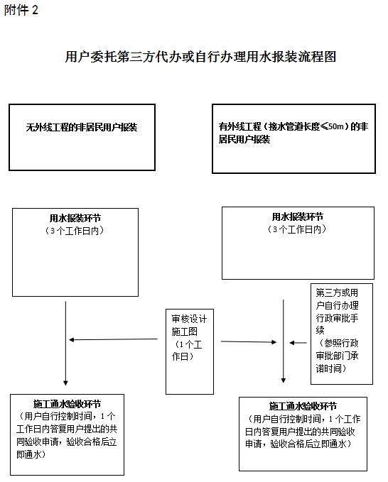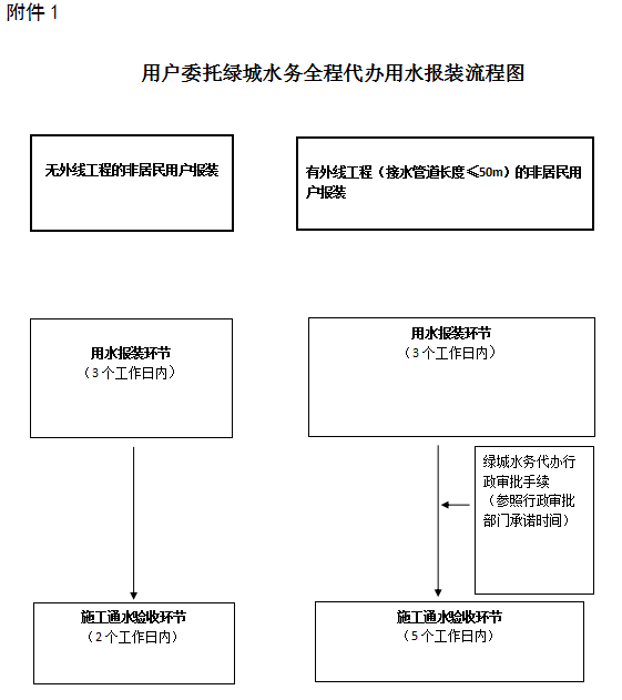 ①委托綠城水務全程代辦的,無外線工程施工通水驗收時間不超過2個工作日,有外線工程(外線工程長度≤50m)施工通水驗收時間不超過5個工作日,不包含辦理行政審批手續時間。