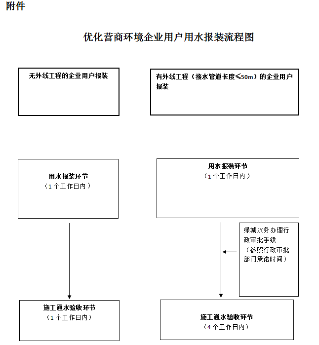 2.施工通水驗(yàn)收環(huán)節(jié):無外線工程施工通水驗(yàn)收時間不超過1個工作日,有外線工程(外線工程長度≤50m)施工通水驗(yàn)收時間不超過4個工作日,不包含辦理行政審批手續(xù)時間。