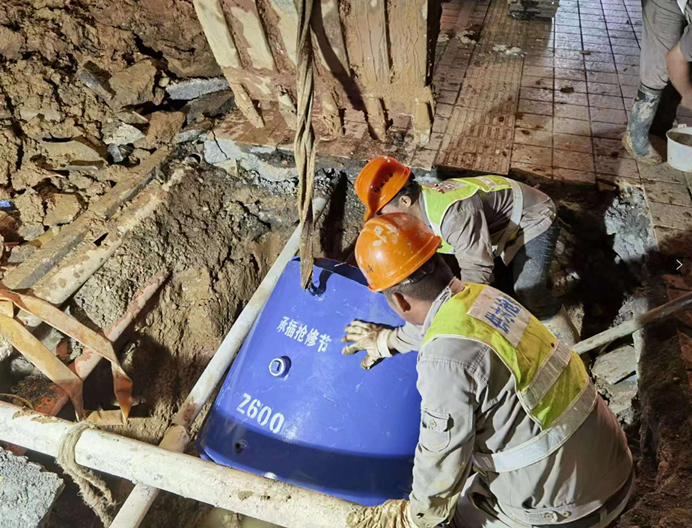 (凌晨時(shí)刻,搶修人員正在為破損水管安裝哈夫搶修器)